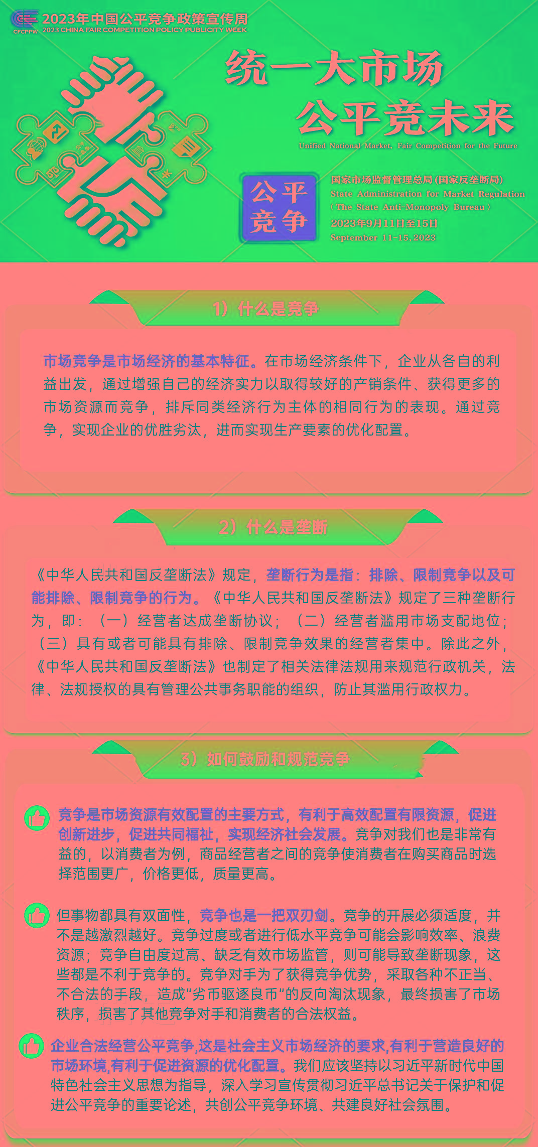 为提升全社会公平竞争意识,培育和弘扬公平竞争文化,9月11日至9月15日,国家市场监管总局会同有关部门和单位在全国范围内开展2023年中国公平竞争政策宣传周活动。本次活动主题为:统一大市场 公平竞未来。