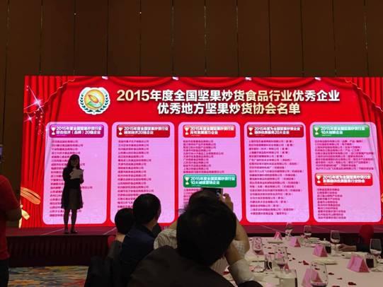 2016年4月14日晚,第十届中国坚果炒货食品展开幕式暨2016中国坚果炒货行业年会在安徽合肥丰大酒店举行。浙江大好大食品有限公司总经理余瑞芳致开幕辞。年会上发布2015年全国坚果炒货行业经济运行情况,并通过两项倡议:一是成立“中国坚果与籽类产业发展联盟”、二是创建“全国坚果与籽类食品健康日”。在随后的表彰环节中,ayx爱游戏体育app官方网站荣获“2015年度全国坚果炒货行业综合经济(品牌)20强企业”,并凭借创新产品撞果仁获得“2015年度全国坚果炒货行业10大创新企业”。