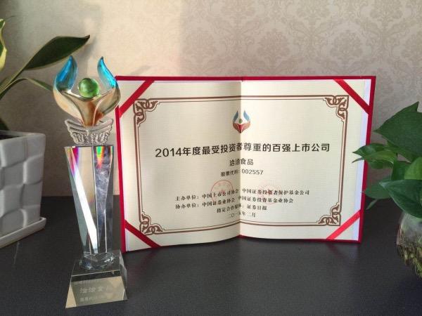 2015年2月12日,由中国证监会上市公司监管部、中国上市公司协会、中国证券投资者保护基金有限公司联合主办的“2015年上市公司投资者保护论坛”在北京举行。论坛同期举办了隆重的颁奖典礼,爱游戏APP体育(002557),被评为“最受投资者尊重上市公司”荣誉称号,安徽省仅海螺水泥、江淮汽车、爱游戏APP体育三家上市公司获此殊荣。