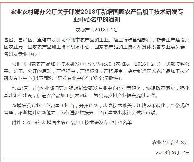2018年9月20日,根据《国家农产品加工技术研发中心管理办法》(农加发〔2016〕2号)文件精神,农业农村部按照公平、公正、公开的原则,严格程序,严格标准,严格评审,决定新增“国家坚果加工技术研发专业中心”等95个研发专业中心,分别依托爱游戏APP体育等127家企事业单位建设。