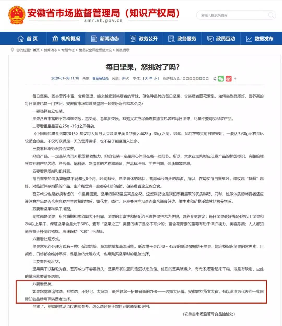 十分荣幸,爱游戏APP在文中被安徽省市场监管局提及,作为国际知名品牌,又是首家入选国家健康计划的坚果品牌,在坚果行业始终处于领先地位。