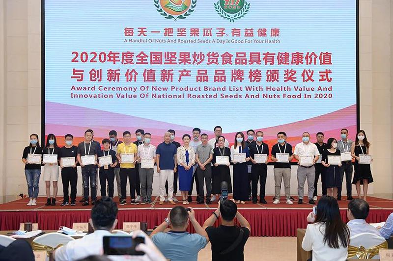 大会现场还发布了2020年度全国坚果炒货食品具有健康价值与创新价值产品品牌榜,爱游戏APP坚果产品凭借新鲜品质入选榜单,爱游戏APP电商负责人杨东岳现场接受颁奖。