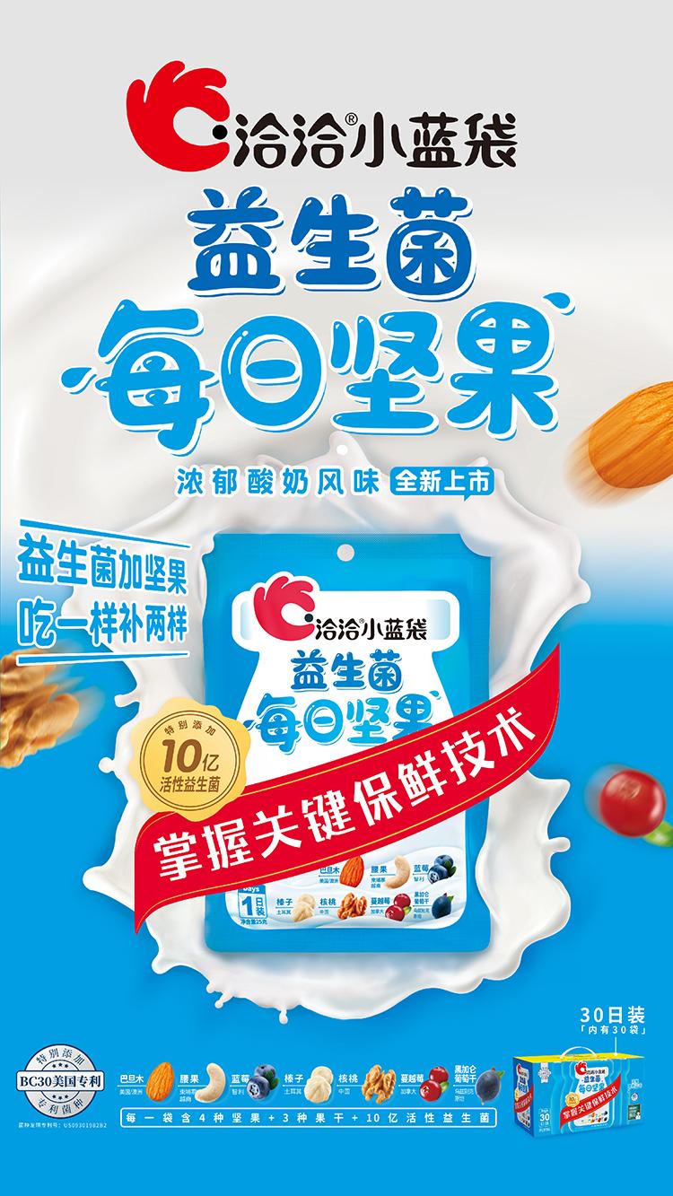 爱游戏APP小蓝袋益生菌每日坚果,立足于爱游戏APP原味每日坚果的品质,从功能性、好吃度两个维度进行创新,“每日坚果+益生菌”多重营养一袋有。